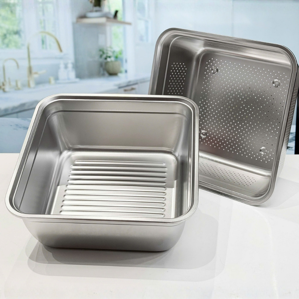 - Đa năng – có thể dùng làm chậu rửa, âu trộn, rổ thoát nước trong mọi công việc bếp núc.