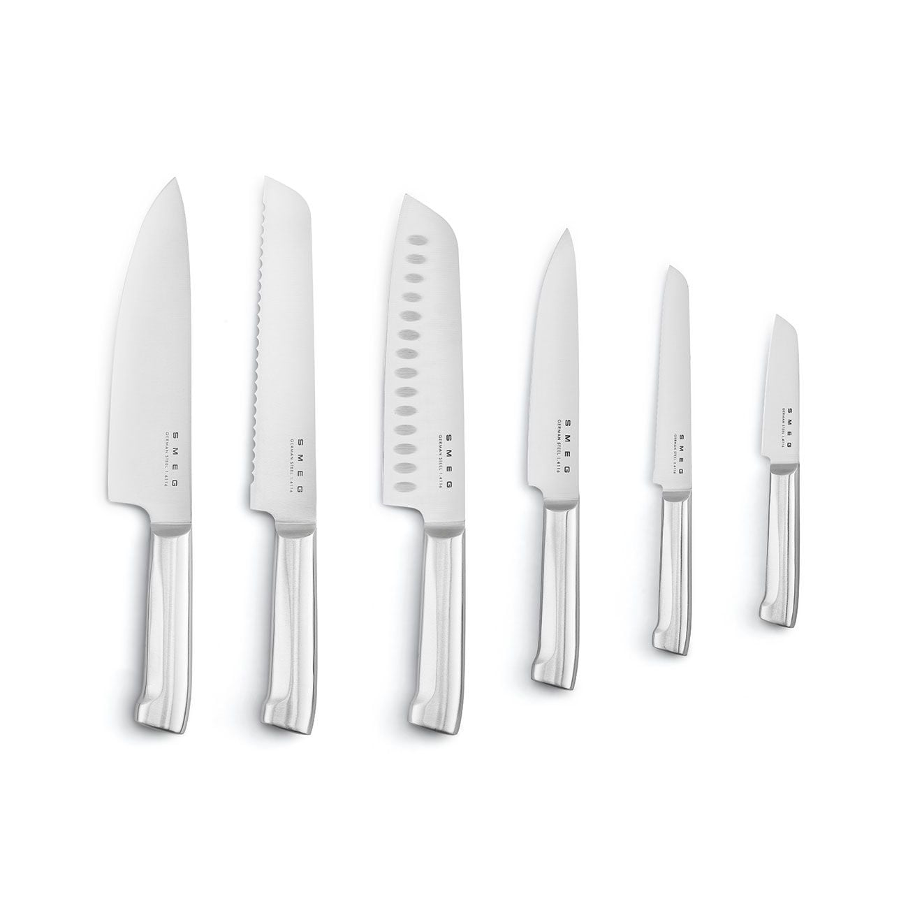 Bộ dao bao gồm 6 con dao thiết yếu, mỗi con được thiết kế để đáp ứng nhu cầu cụ thể: dao bào rau củ 8cm; dao đa năng 13cm, linh hoạt và lý tưởng cho các loại thực phẩm với kết cấu khác nhau; dao chặt thịt 15cm; dao Santoku 18cm, lý tưởng để cắt thịt, cá và rau củ; dao cắt bánh mì 19cm; và cuối cùng, dao đầu bếp 19cm, con dao đa năng không thể thiếu trong mọi nhà bếp.