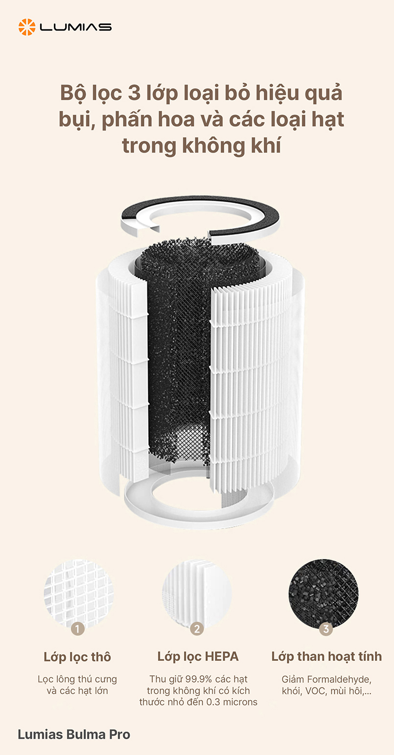 Hệ thống lọc 3 lớp của Lumias Bulma Pro mang đến khả năng lọc không khí vượt trội. Nhờ khả năng loại bỏ tối đa các loại bụi bẩn, vi khuẩn, virus, khí độc hại, bộ lọc này bảo vệ sức khỏe toàn diện cho cả gia đình. Với độ bền cao, bộ lọc còn giúp kéo dài tuổi thọ của máy lọc không khí, mang đến hiệu quả sử dụng lâu dài.