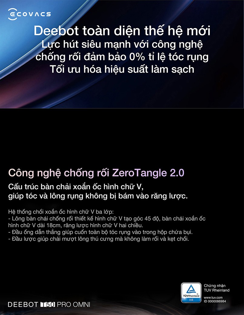 Robot hút bụi lau nhà Ecovacs Deebot T50 Pro Omni 2025 trang bị công nghệ ZeroTangle 2.0