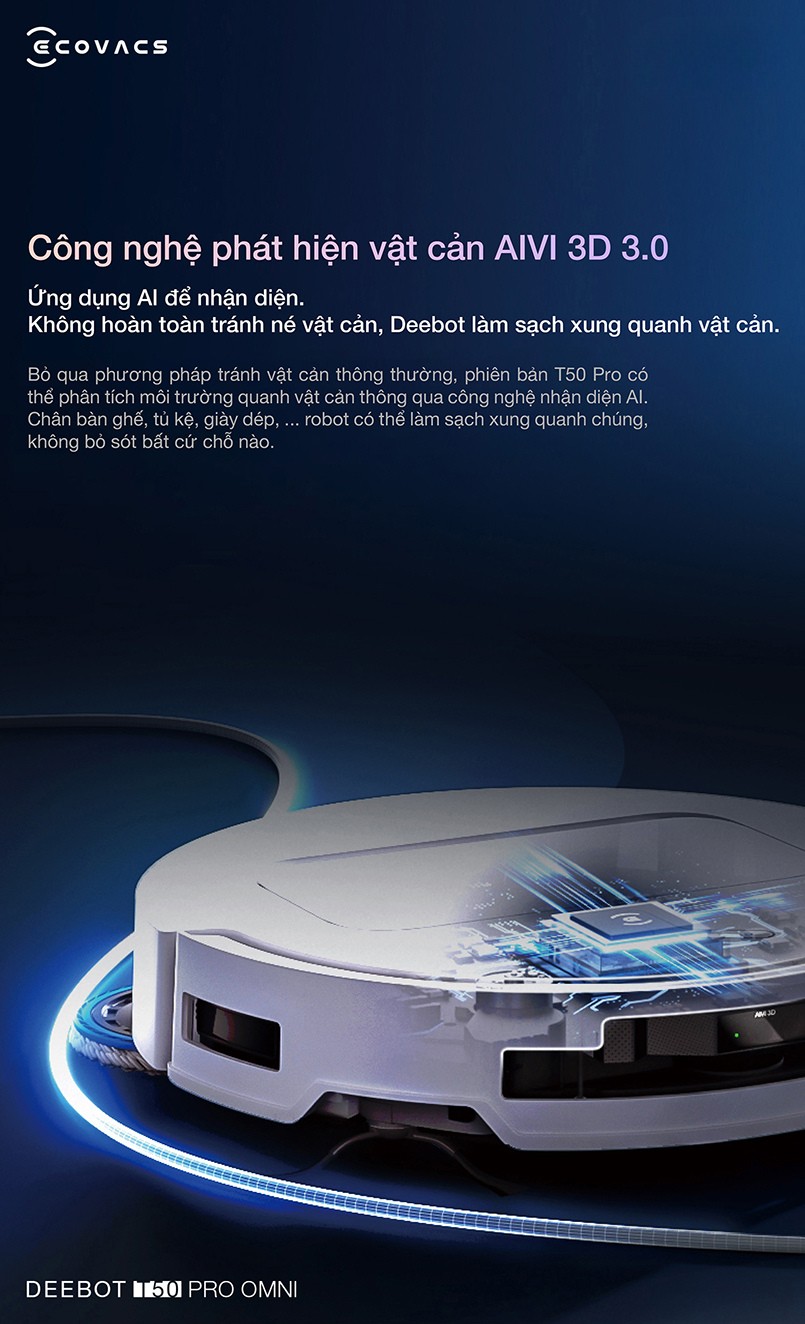 Công nghệ AIVI 3D 3.0 có thể hiểu hình ảnh bằng trí tuệ nhân tạo nhờ việc kết hợp giữa ánh sáng cấu trúc 3D và camera RGBD để tạo ra một bản đồ 3D chi tiết về không gian xung quanh robot. Từ đó, robot hút bụi lau nhà Deebot T50 Pro Omni có khả năng phân biệt được các vật cản khác nhau như đồ vật, thú cưng, dây điện,… có độ chính xác cao. Robot sẽ tự động điều chỉnh đường đi để tránh va chạm các vật cản, bảo vệ cả robot cũng như đồ nội thất trong nhà.