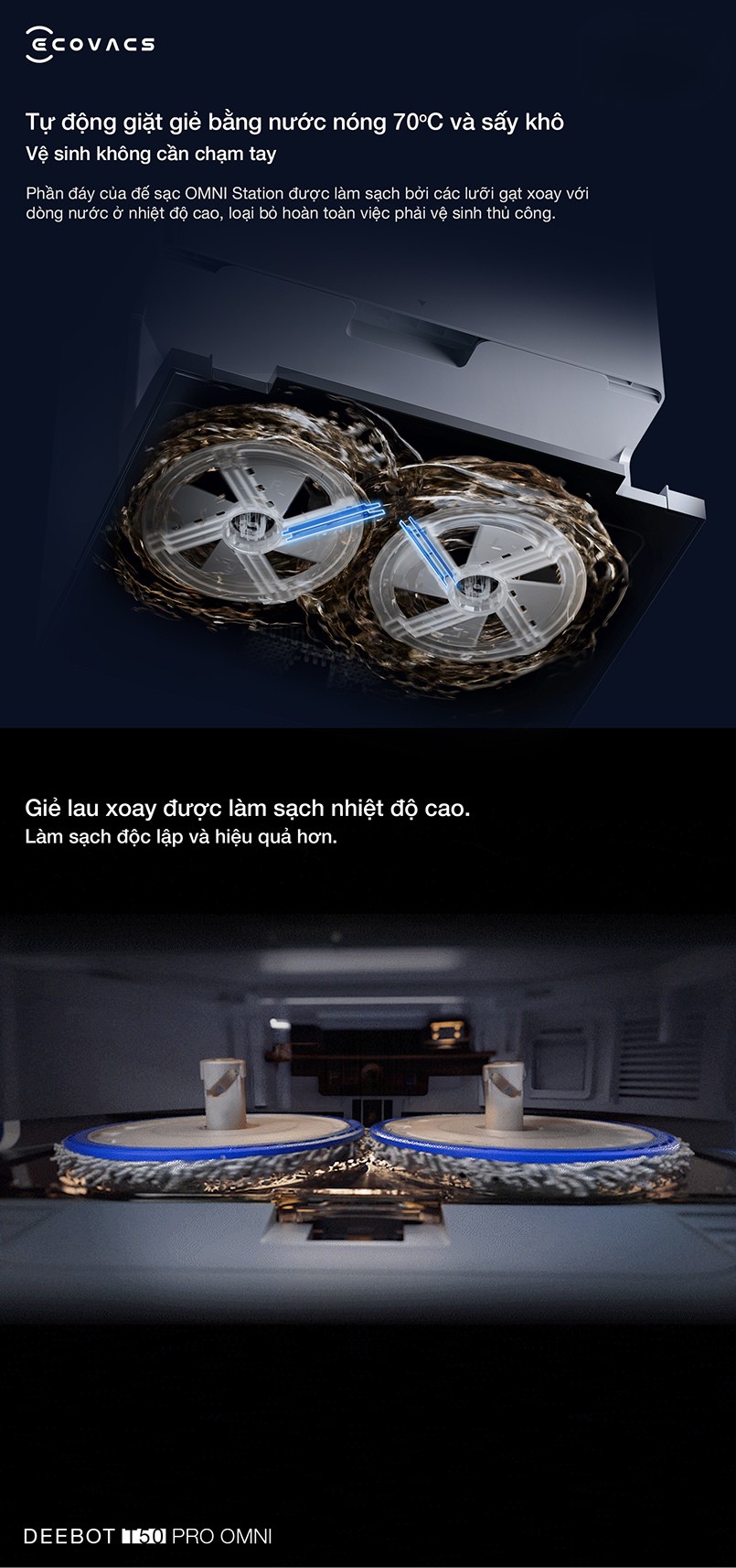 Robot hút bụi Deebot T50 Pro Omni tự động giặt giẻ bằng nước nóng 70°C, sấy khô giẻ hiệu quả