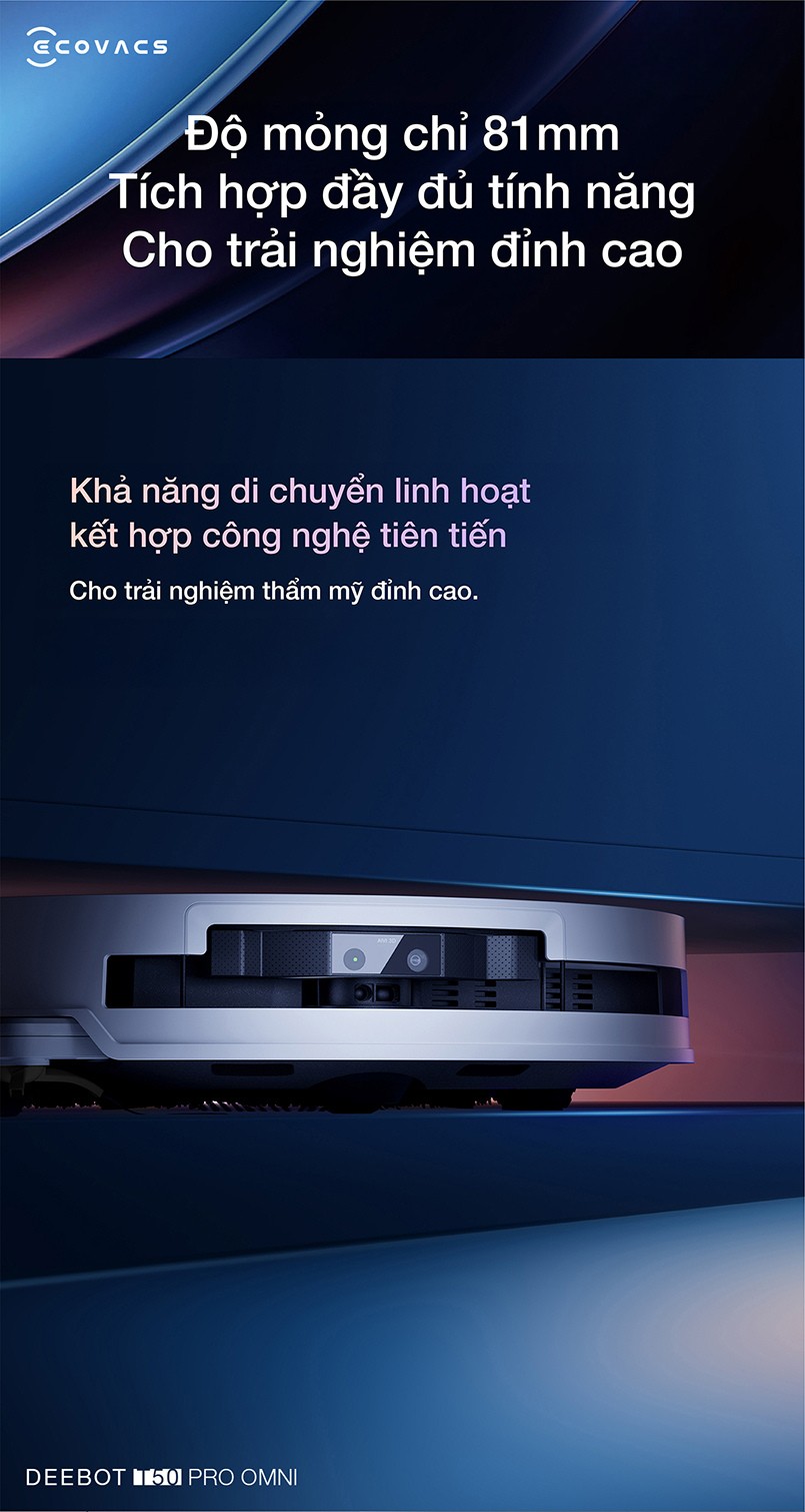 Trong xu hướng thiết kế nội thất hiện đại, đồ đạc thường được đặt sát sàn để tạo không gian thoáng đãng. Tuy nhiên, điều này cũng đồng nghĩa với việc việc vệ sinh những khu vực dưới gầm giường, gầm tủ… trở nên khó khăn. Hiểu được điều này, robot hút bụi lau nhà Ecovacs Deebot T50 Pro Omni ra đời, thiết kế siêu mỏng chỉ 81mm giúp len lỏi sâu hơn để làm sạch kỹ lưỡng từ gầm giường, tủ sofa đến những góc khuất nhỏ nhất đều được vệ sinh, đảm bảo không bỏ sót bất kỳ hạt bụi nào.