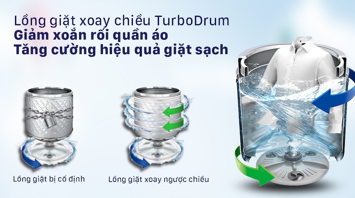 TurboDrum™ hoạt động dựa trên nguyên lý xoay đảo hướng của lồng giặt và mâm giặt ngược chiều nhằm tạo ra xoáy nước mạnh mẽ để đánh bật những vết bẩn cứng đầu nhất.