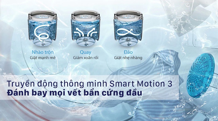 Máy giặt LG Smart Inverter 13kg T2313VS2W trang bị Smart Motion, là 3 chuyển động giặt, phù hợp với từng loại vải khác nhau. Nhờ vậy, quần áo nhà bạn sẽ được chăm sóc kỹ lưỡng, hoàn hảo nhất.
