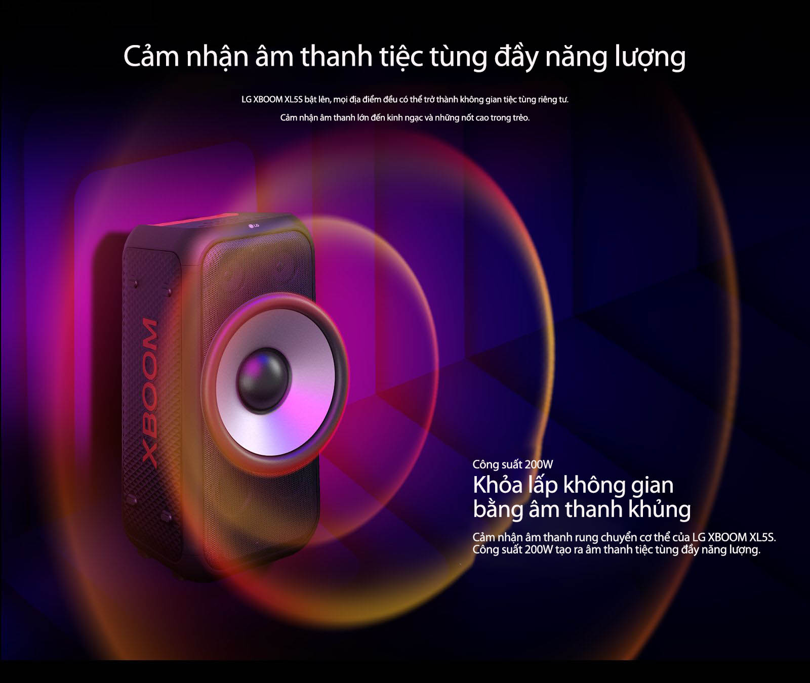 Âm thanh lớn hơn, tiệc tùng xung hơn. LG XBOOM XL5S lấp đầy không gian bữa tiệc bằng âm thanh tiệc tùng đầy năng lượng.