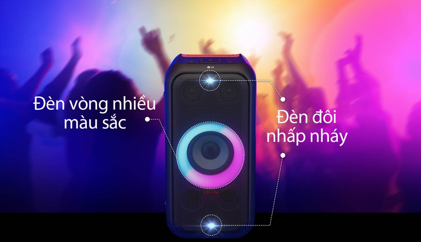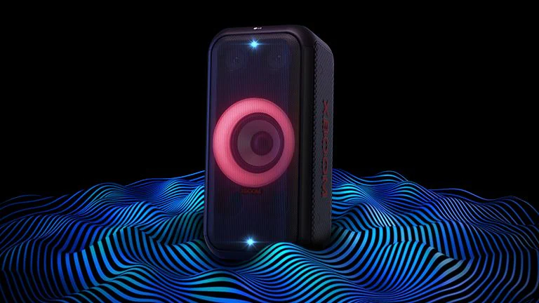 LG XBOOM XL5S trình diễn ánh sáng theo nhịp điệu— Đèn vòng nhiều màu sắc. Vũ điệu ánh sáng cùng với âm nhạc mang lại năng lượng sôi động cho bữa tiệc.