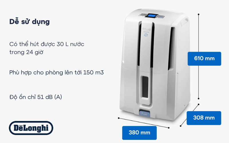 - Độ ẩm cao không chỉ gây khó chịu mà còn tạo điều kiện cho vi khuẩn, nấm mốc phát triển, ảnh hưởng đến sức khỏe và đồ đạc trong gia đình. Với công suất hút ẩm lên đến 30L/ngày, De’longhi DD230P giúp duy trì độ ẩm lý tưởng cho không gian có diện tích lớn lên đến 150m³.