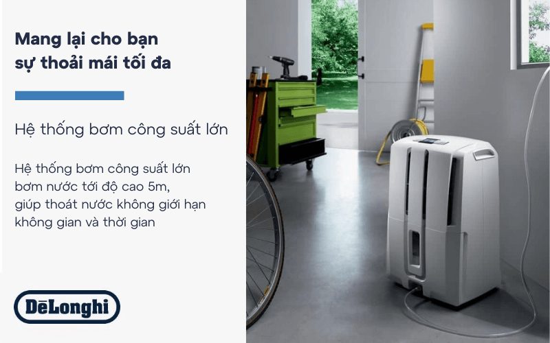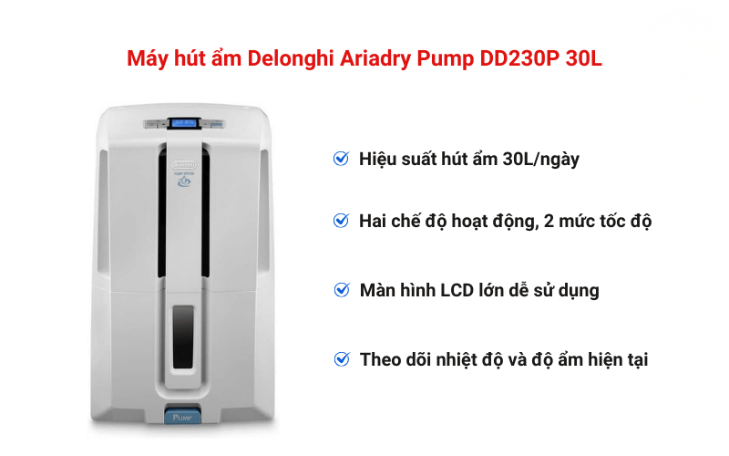 - Máy hút ẩm De’longhi Ariadry Pump DD230P 30L là sự lựa chọn hoàn hảo cho những ai đang tìm kiếm một máy lọc khí và hút ẩm hiệu quả. Với công suất hút ẩm lớn, hệ thống bơm thông minh, thiết kế tiện lợi và thân thiện với môi trường, sản phẩm này đáp ứng đầy đủ nhu cầu kiểm soát độ ẩm trong không gian sống.