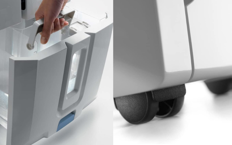 - Tay cầm tích hợp và bánh xe giúp di chuyển máy dễ dàng từ phòng này sang phòng khác mà không tốn nhiều công sức. Thiết bị cũng hoạt động êm ái, không gây tiếng ồn lớn, đảm bảo sự yên tĩnh cho không gian sống.