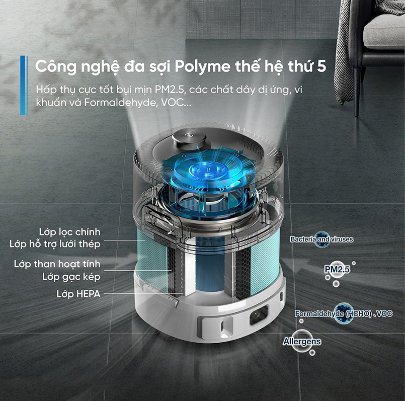 Lớp lọc chính giúp loại bỏ mảnh vụn, tóc, sợi,…, lớp hỗ trợ lưỡi thép giúp đảm bảo tuổi thọ lâu dài cho bộ lọc, 2 lớp gác sẽ ngăn chặn sự rò rỉ của than hoạt tính, 5 lớp than hoạt tính giúp loại bỏ khói thuốc, sâu aldehyde,… Đặc biệt với lớp HEPA cấp độ H13 hàng đầu trong ngày có thể giúp loại bỏ hiệu quả 105 vật chất hạt, lọc sạch 99,99% các vi khuẩn gây bệnh như: E.coli, virus tay chân miệng và cúm,… Mang đến nguồn không khí tươi mát, trong lành và kháng khuẩn tuyệt đối, bảo vệ sức khỏe gia đình. Ecovacs Airbot Ava vô cùng thích hợp với những gia đình có trẻ nhỏ, người lớn tuổi hoặc người có nguy cơ mắc các bệnh về đường hô hấp.